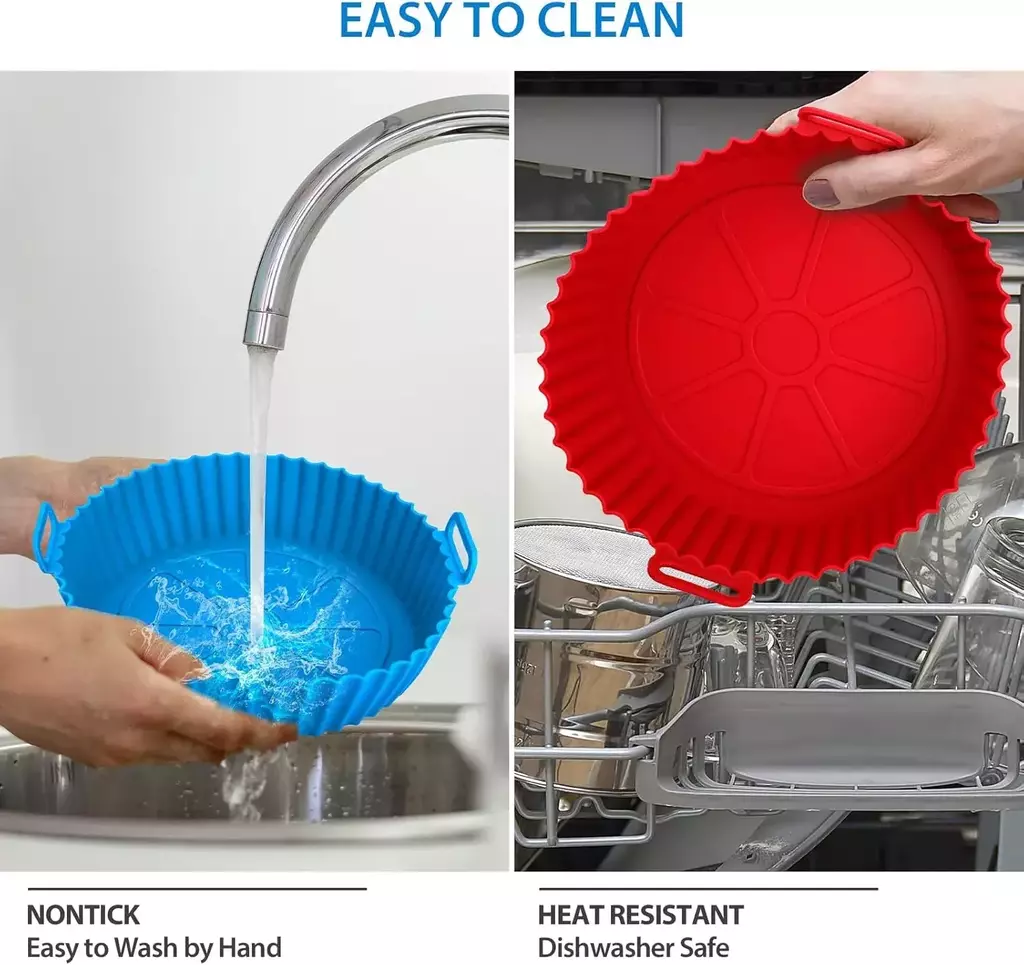 ?Design exclusivo de circulação de ar?Nossas inserções de silicone para fritadeira de ar são projetadas alguns recessos de treliça que ajudam a distribuir o calor e a circulação de ar uniformemente.O óleo da carne pode fluir para as ranhuras profundas na parte inferior da fritadeira para que o óleo nunca toque mais os alimentos fritos!Deixe você desfrutar de uma comida mais crocante e deliciosa.