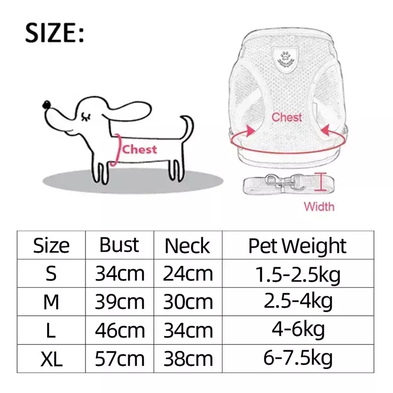 2. cão ajustável ou gato arnês. Existem 2 fivelas ajustáveis no arnês de estimação que podem ser ajustadas de acordo com o tamanho dos cães ou gatos.