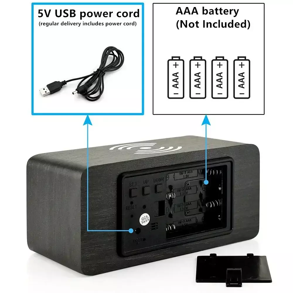 QI WIRELESS CHARGING: Simply place your Qi Wireless Charging Compatiable phone on top of the clocks and it'd start charging automatically. Charging occurs only when powered by USB cable, not chargeable when powered by batteries. Please note phones with a support ring on the back will not be fully charged, please remove support ring for charging. Please position phone in the middle vertically with back facing down, or charging might fail.