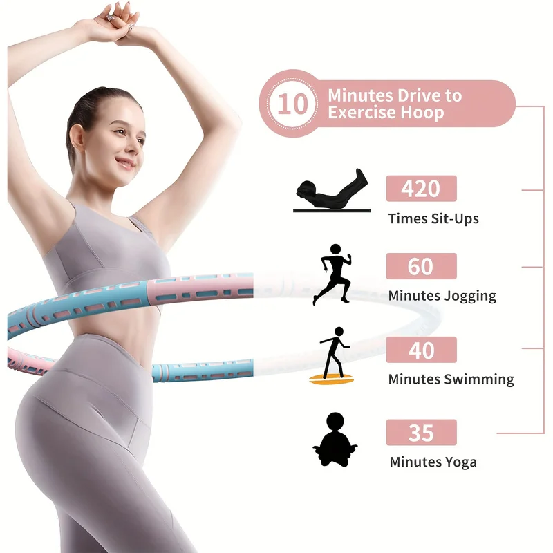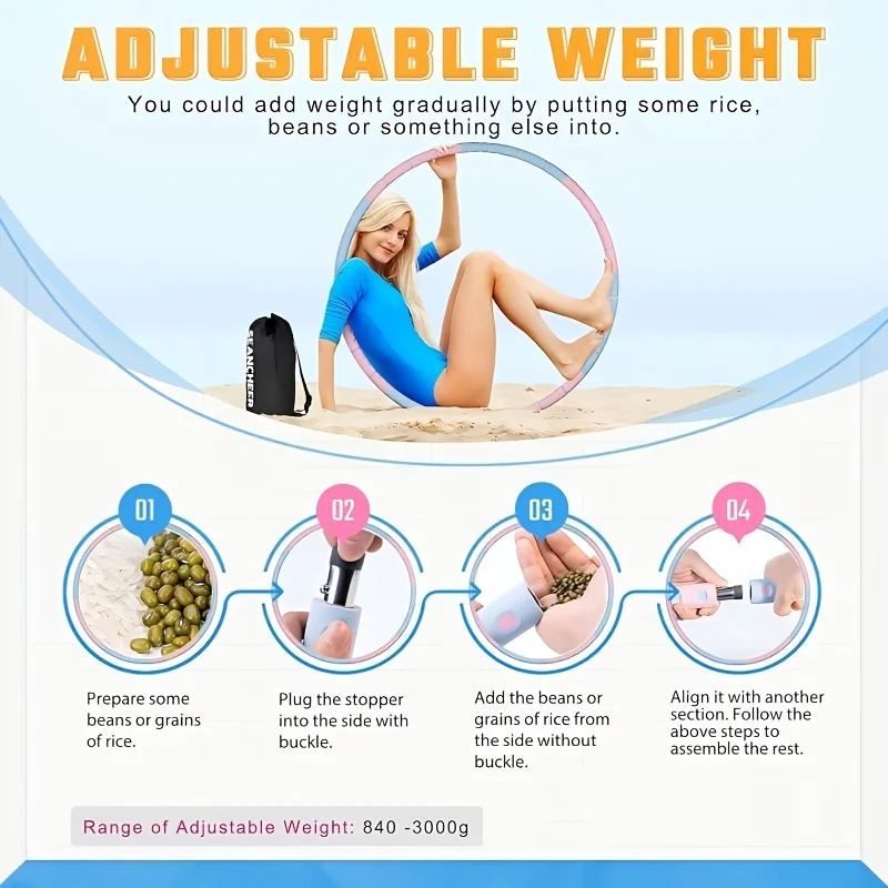 4. botão destacável oculto, é agravado para acelerar a queima de gordura e adicionar bolas de areia/arroz/aço ao seu aro de fitness com base no seu peso e exercício