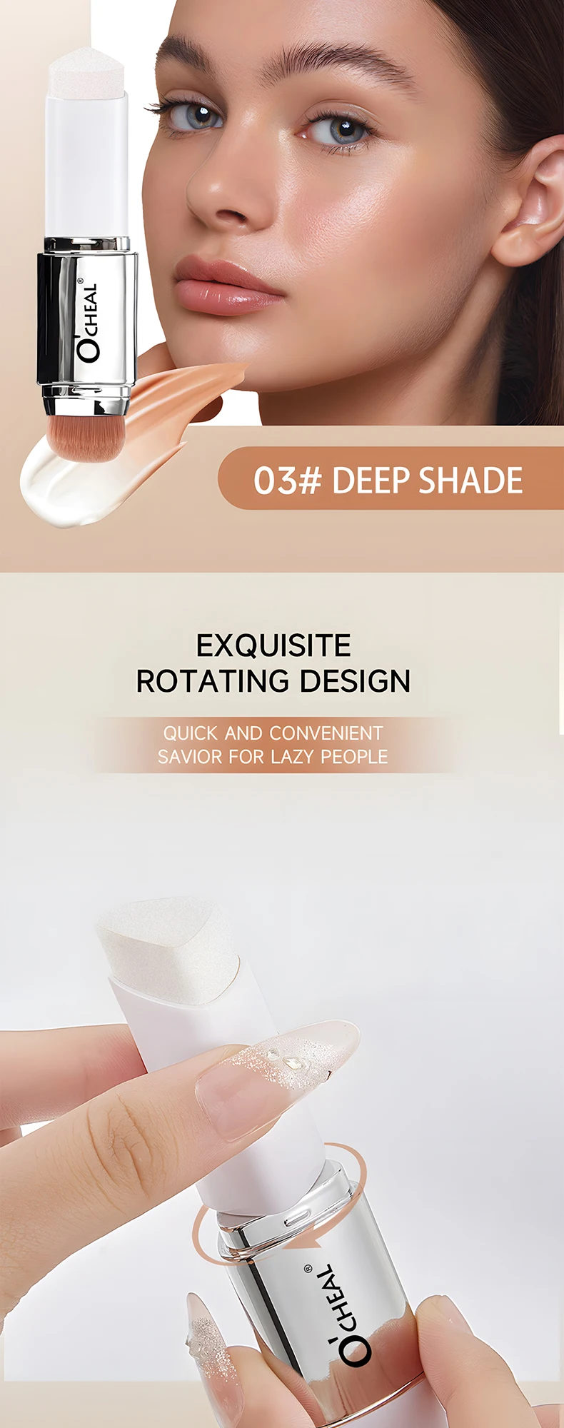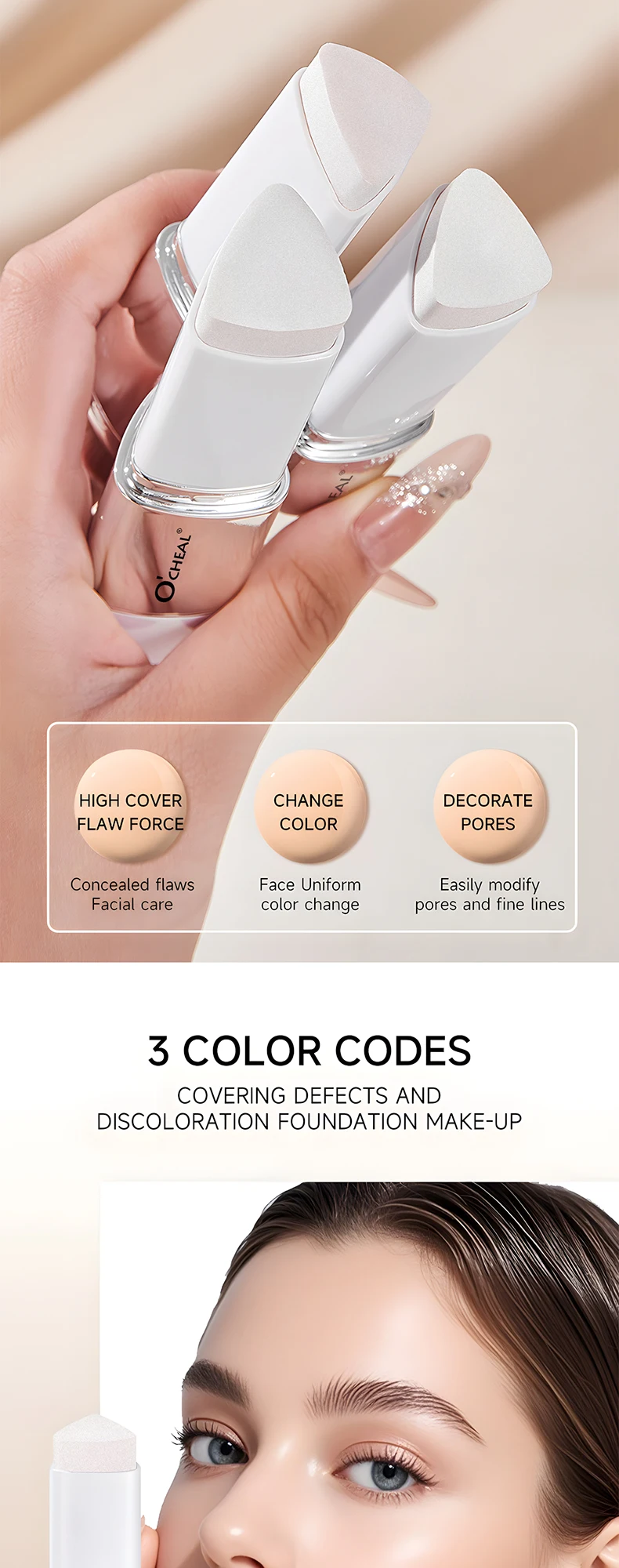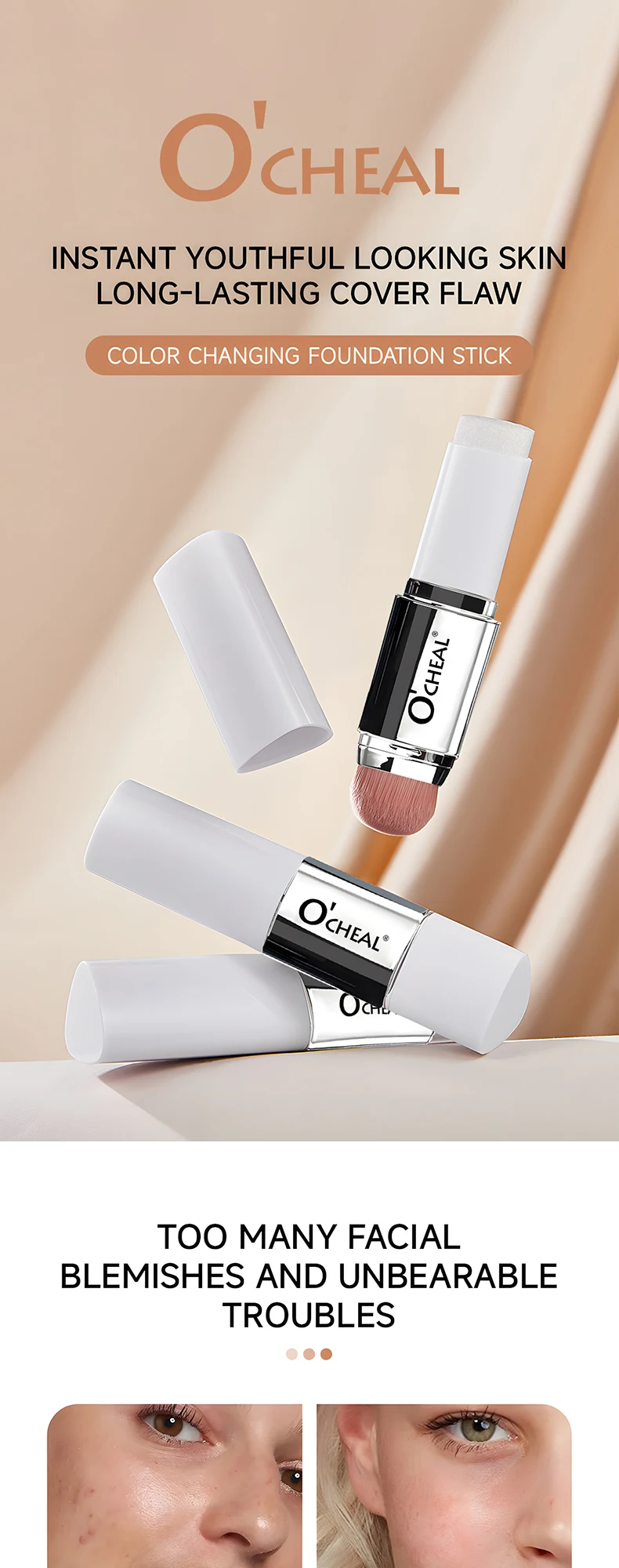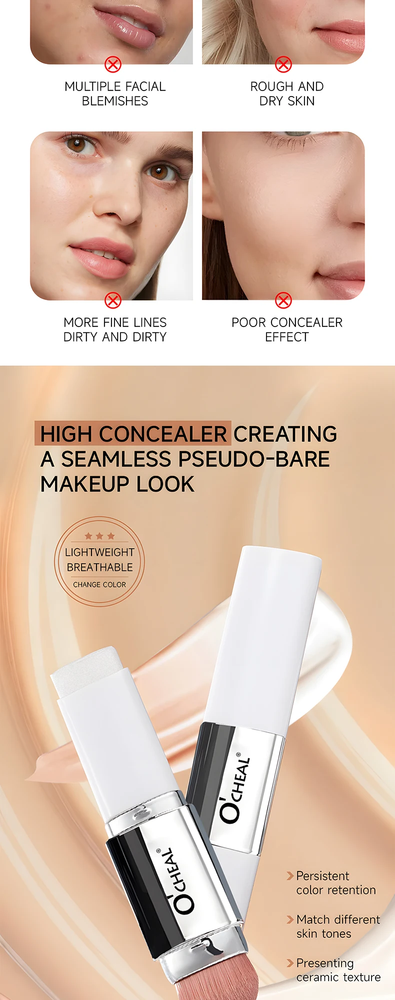 O'CHEAL Base em bastão que muda de temperatura, cobertura fosca, manchas nos poros, duas cabeças, com pincel, à prova d'água, hidratante, duradouro, cobertura facial, creme de maquiagem